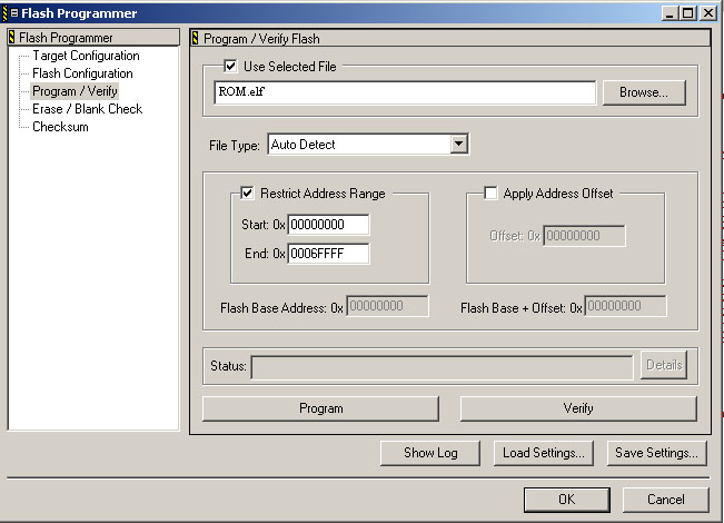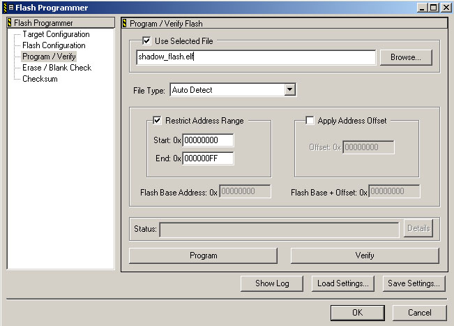 13. Next, program your flash with the "shadow_flash.elf" file found in Config.zip as shown below. The restrict address range settings should already be set correctly. If they are not, you did not load the settings correctly and need to do so.