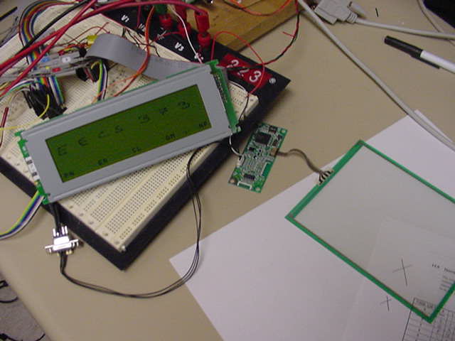After much hard work and effort, our design worked the way we expected. The major problem we had was to understand the working of the touch panel. We did not had any proper documentation for the controller board which came with the touch panel. We did not know what kind of data was coming out of the touch panel. To understand the touch panel, we connected the touch panel directly to the computer's com port, this way we thought we will be able to see what kind of data were we getting from the touch panel on the hyper terminal. We did get some data on the hyper terminal but it was not in a readable format, the windows hyper terminal kept showing some random characters which were not making any sense. Therefore, to understand that data, we downloaded a software called indigo which showed the data coming in from the com port in hexadecimal form. After understanding the data received, we came to know that we were getting a header data followed by four 8 bit data for the coordinates. Then we were able to map these coordinates on to the LCD.