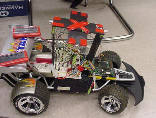 By Matt Fornero and Ryan Pelavin Walk the Dog is our final project for EECS 373. The goal of the project was to create a self-navigating car, capable of honing in on an ultrasound beacon. The original design document called for IR sensors to perform obstacle avoidance as well. The project was implemented using the MPC555 for car control, and one of the RC cars from the lab, with the steering servo replaced. The project name comes from the ultimate implementation of the design; in which one can "drag" the car around using an ultrasonic beacon. |