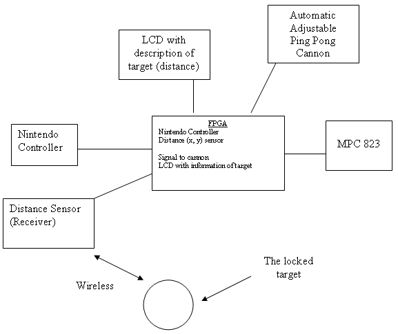 Our goal for this project was to create a launcher that can be controlled to move left, right, up, down, and shoot a ping pong ball with a Nintendo controller. The second part of this project is to interface a sensor so that it auto-calibrates itself to a specific target in a 3ft to 10ft range on a push of a single button. In addition to this, there will be an LCD that will display a welcome note and eventually the distance of the closest target in the sensor's range. We will use a simple Toys'R'us launcher mounted on a trebuchet that will rotate. The user will chose a target horizontally and press a button where it will auto-calibrate and let the user shoot it.