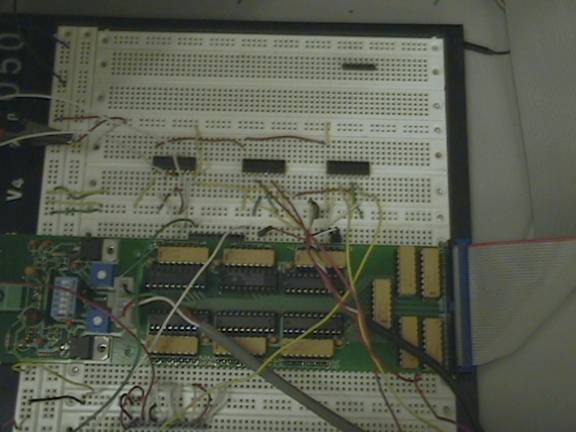 The LCD is memory mapped to address 0x02600004. Once the address is written to and TA* is asserted, the data to the LCD (PD_IN[31:24]) is latched to the test points and the PD_IN23 is driven to the RS pin of the LCD. RS is latched using LCD's clock and shifted/combined to meet the typical 500ns time requirement. The enable signal is delayed by 2.5 microseconds since that's the maximum time for every transaction. The RD/WR* was directly hooked up to GND since we are always writing to it.