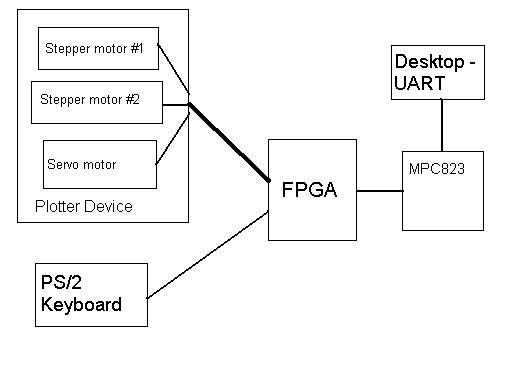 The general subcomponents of our design include the plotter device itself (including two stepper motors, and a servo motor) and its associated electrical circuitry, a PS/2 kayboard, the FPGA (containing the logical hardware to read from the keyboard and control the plotter device), and the MPC823. They interact as seen in the following diagram: