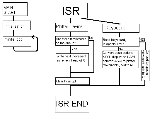 We used assembly for the majority of the code, except for the conversion tasks. We had C functions to convert from scan codes to ACSII (or special movements in some cases), and C code to convert from ASCII to plotter device movements. All device movements were coded into a 32-bit line, so all three motors could be controlled in one write. Below is the general flow of our software: