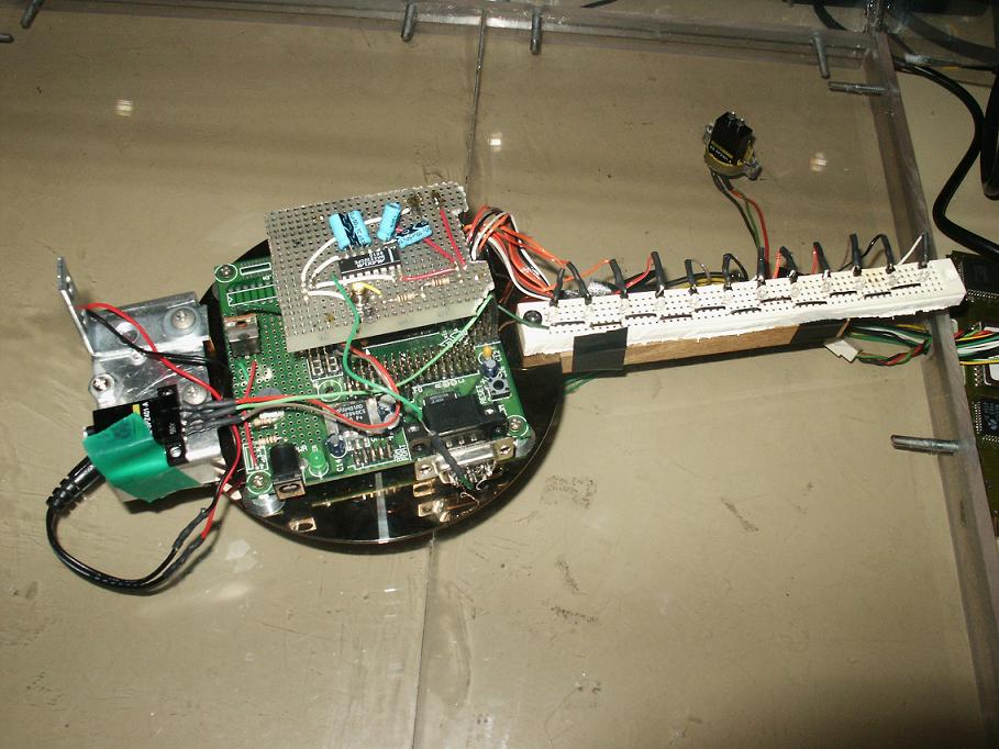 The MPC 823 processed the user input from a game pad and displayed information on a LCD panel. It sends the user input to the MPC 555 via serial port with a laser and a light sensor in between the two serial ports. This was required because we could not have a wire connecting the spinning display and the outside world. The MPC 823 FPGA had all of the hardware needed for interfacing to user I/O.