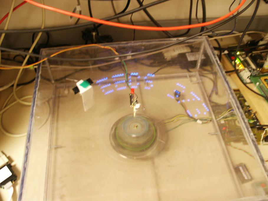 The components for image processing involved a sensor to determine the speed of the wheel for the MPC 555. This information was used to control the refresh rate of the display (how quickly the LEDs turned on and off). The MPC 555 had a buffer for image data and a font set for display. The Display Wheel had the MPC 555 attached to a disk which was mounted on a motor. Also attached to the disk was a stick with LEDs attached to it and the speed sensor.