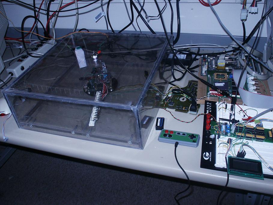 We programmed the MPC 823 FPGA to make hardware to control the LCD, motor, and game pad. The LCD hardware used counters to allow for the setup and hold times of the LCD. The eight pins on the Expansion Board that were set up for input and output were used for the data bus lines to the LCD. The DIR pin on the Expansion Board was used to control the settings for the eight pins. We chose to implement a bidirectional link to the character display so we could check the busy state of the screen controller to know that it was safe to write the next character.