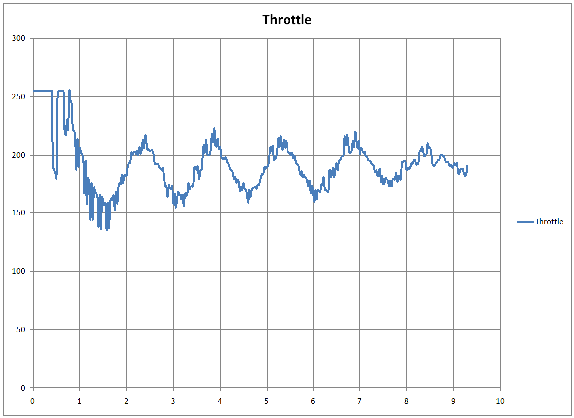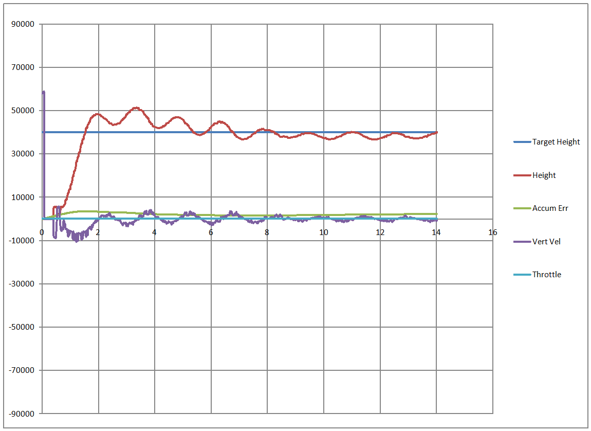 In order to better tune the helicopter, logs of the helicopter's sensor data as well as information on the controller's behavior was output to a PC via a serial port. A few sample graphs of data can be seen below: