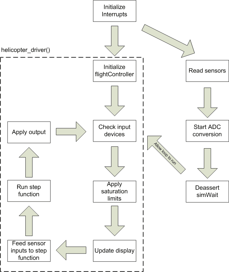 The software consisted of one main loop responsible for controlling the helicopter and LCD display, several periodic interrupts to service the sensors, and interrupts driven by button presses on the human interface devices.