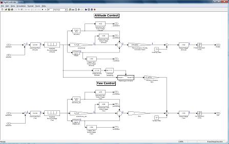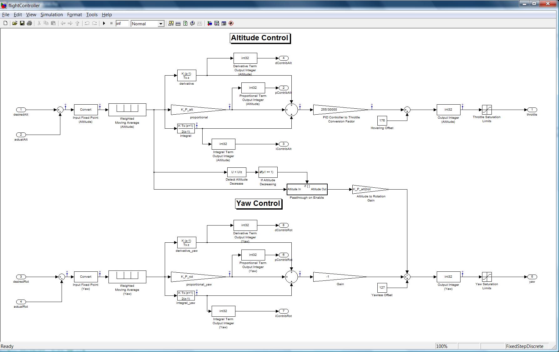 In essence, the control algorithm is two PID-controllers implemented in software. A moving average filter sampling the last four units of time helps protect against erroneous values retreived by either of the sensors. Since the MPC823 processor does not support floating-point, a fixed-point data type was used for all of the system's calculations. Another feature of the control system worth pointing out is the feedforward term from the throttle control to the yaw control. In testing, it became apparent that any time the helicopter descended, it had a tendency to yaw to the left. To counteract this tendency, a data path from the altitude controller to the yaw controller was added.