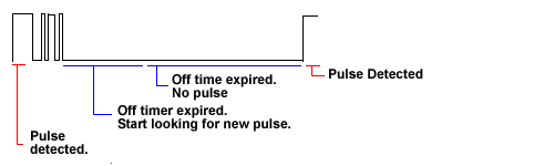 Since we don't care about the information encoded in the signal we sample the signal and whenever a rising edge is seen from the IR, we start a counter. If a specified value is reached and the signal has remained high, we consider that block to be "signal present". We then wait a specified time and start checking again. If a complete cycle passes and no pulses of sufficent width are seen, we interpert that block to be "no signal present".