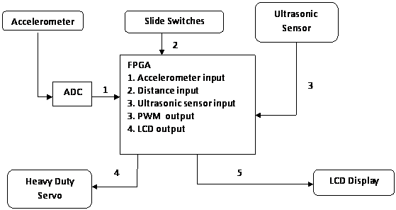Our overall project design is a “mini-golf” game in which the user controls the force applied to the ball in order to putt the ball into a virtual “hole”. We intend to control the force applied by using an accelerometer. The “club” used to putt the ball will be controlled by a heavy duty servo, which will generate the force to push the ball forward. An ultrasonic distance sensor will inform the player about how close he manages to putt the ball near the virtual hole, scoring more points the nearer the ball is to the hole. The player’s score will be updated on the LCD display. The distance of the ball starting position from the virtual hole will be able to be adjusted via the slide switches on the FPGA.