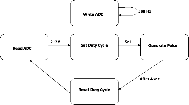 The largest value among the 500 stored in memory is used to determine duty-cycle. A linear scale was used: 3V generates a duty cycle of 3%, while 4.8V produces a duty cycle of 12%. The duty cycle is reset to 1% 4 seconds after a new PWM is generated.