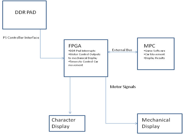 We needed to work with six pins on the play station controller: DATA , GND, VCC, ATT, CLK and CMD. DATA needs a 100k PULL-UP resistor. In researching, we found a previous 373 project (DDR-A-MOLE) gave us some great links to get started. We used the same DDR Pad as this project, but we found that the description this group gave on how to interface with the pad was flawed. This group did not use the CMD and held the ATT signal active low for much shorter time than we needed to. After having problems for a couple days with this, we decided to interface with the pad using the traditional CMD signal. We pulled ATT low every .8 milliseconds. This signal stays low for over 32 DDR clk cycles. The DDR Clk runs at about 156 kHz. The buttons are active low. We found that we only needed to drive the clk when the ATT signal is low. For debugging purposes, the ps2 controller will only drive data on the falling edge of the clk and can be latched on the rising edge. This enables us to keep the clk signal high after every byte of data, so that we can easily distinguish the bytes. See the references for a great link of how we found this possible (See References). After ATT is pulled low, we send 0x01 as the first byte on the CMD signal, then we send 0x42 as the next byte. The data will then follow after these commands. The DDR-A-Mole group did not do this and we were unsure of how they got the pad to work without this signal.
