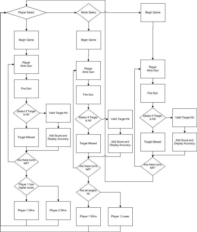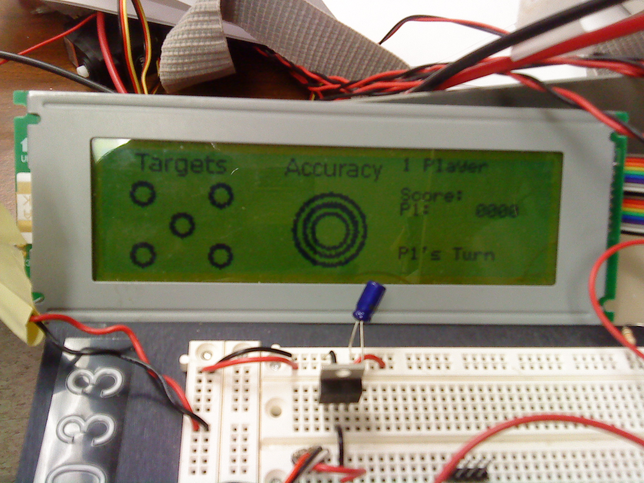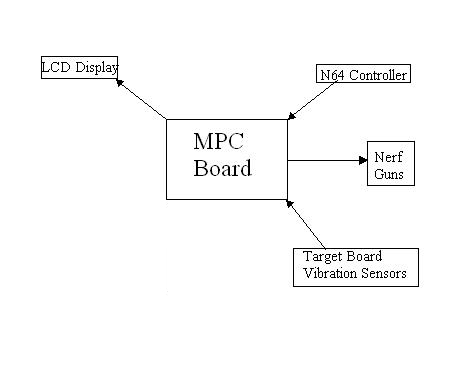 Our team’s goal was to create a game where players control a Nerf Gun with a Nintendo 64 controller and shoot at targets. The player receives points based on whether or not he hits one of the targets with a Nerf dart. The player controls the vertical and horizontal aim of the gun, as well as the trigger mechanism. We also wanted to have a graphics display that illustrates the current point value of the player, accuracy of the shot, and a diagram of what targets have been hit.