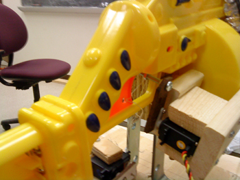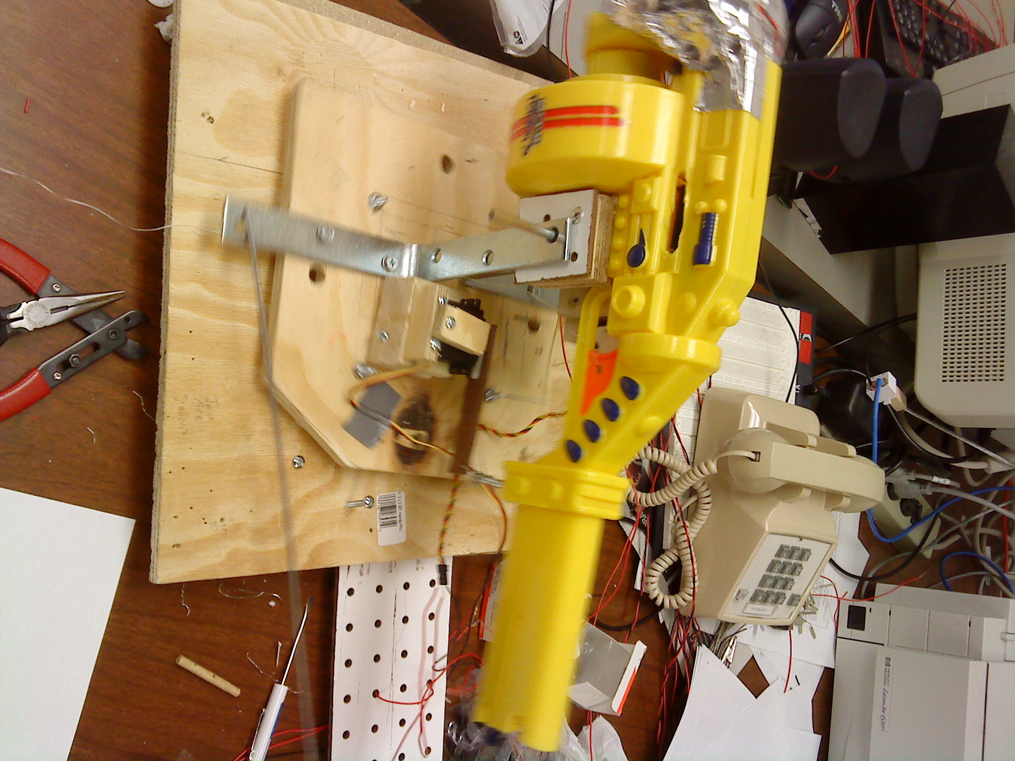 In addition to the mechanical problems of our servos, the entire platform that held the gun together proved to be a mechanical nightmare. We had metal wire and even dental floss holding key pivot points together. The reasoning for this was that we needed a pivot point that was strong enough to hold together but flexible enough to give our gun room for error. Overall, these modifications held together for the most part, yet had to be replaced somewhat frequently due to the consistent use wearing them down.