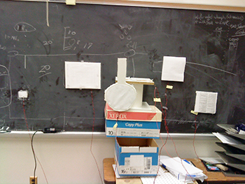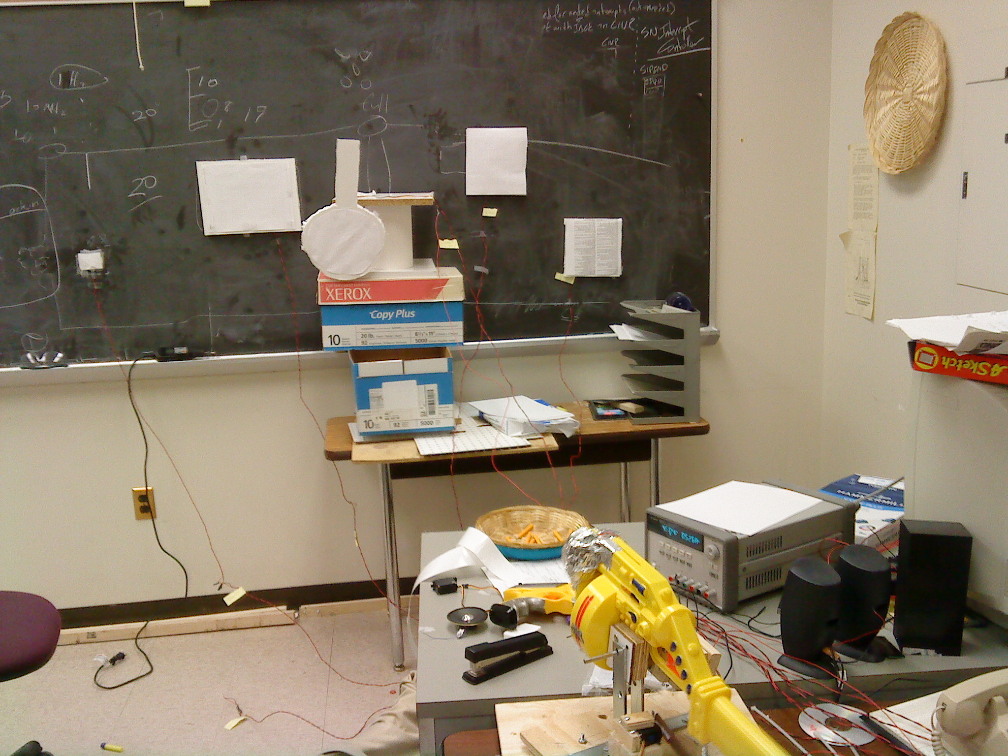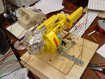 Go back to TopWe encountered a few problems throughout the project, some of which compromised some of the functionality of our project. One of the major problems that we encountered was that the NERF gun we were using produced a significant amount of Electro Motive Force (EMF) when the gun was on. This EMF would cause all of the servos that we used to turn on and off at random, causing misfires and the gun to turn in the wrong direction. We managed to control this problem by isolating the power source of the NERF gun and the power source of the servos by using a secondary power supply. In addition, we were forced to wrap the front of the gun, where the motor was located, with metal foil in order to block as much EMF was we could. This managed to contain the EMF yet occasionally caused the gun to get jammed due to the foil blocking the way of the NERF darts.