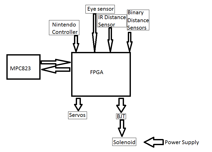 The car's decision path was to rotate until it found the beacon, and drive towards it. If an obstacle is detected in front of the car, the car will attempt to shoot it out of the way. After expending its ammunition, the car will navigate around subsequent obstacles. If the car is driving and gets too close to an obstacle or detects the edge of the table, an interrupt occurs to take over navigation to ensure that the car isn't damaged or halted.