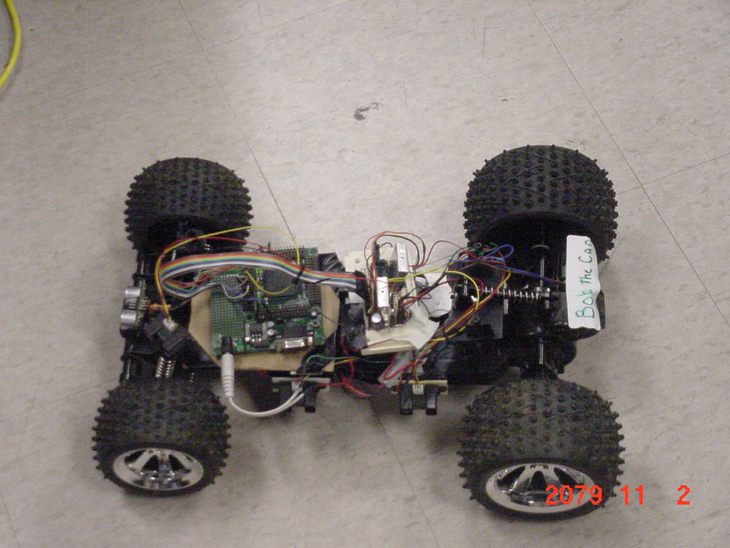 This was our autonomous car project. The car would follow the left wall approximately 30 cm from the wall, back up if it got stuck, dodge obstacles in its path, and turn left when possible. The car worked by reading the input of four sensors that gauged distances in its surroundings and processed these inputs though an algorithm being run on a PPC555 processor to determine its next course of action. The algorithm controlled outputs by adjusting the output of 3 different pulse widths. With the pulses, it could turn right, left, speed up, slow down or reverse.