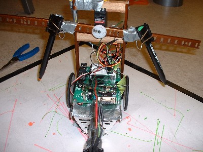 AutoPen is a car with markers attached on top controlled by an 8-bit Nintendo controller. The arrow buttons make the car go forward, backward, and turn, while the A and B buttons raise and lower the right and left marker, respectively. The select button activates (and deactivates) an orthogonal mode that only allows the car to turn at right angles. AutoPen is also equipped with an optical sensor on the front distinguishes between white paper and black electrical tape. When used on a large sheet of white paper held down by black tape, AutoPen turns 180 degrees whenever it reaches the edge of the paper, preventing the user from drawing off the paper and marking up the floor.