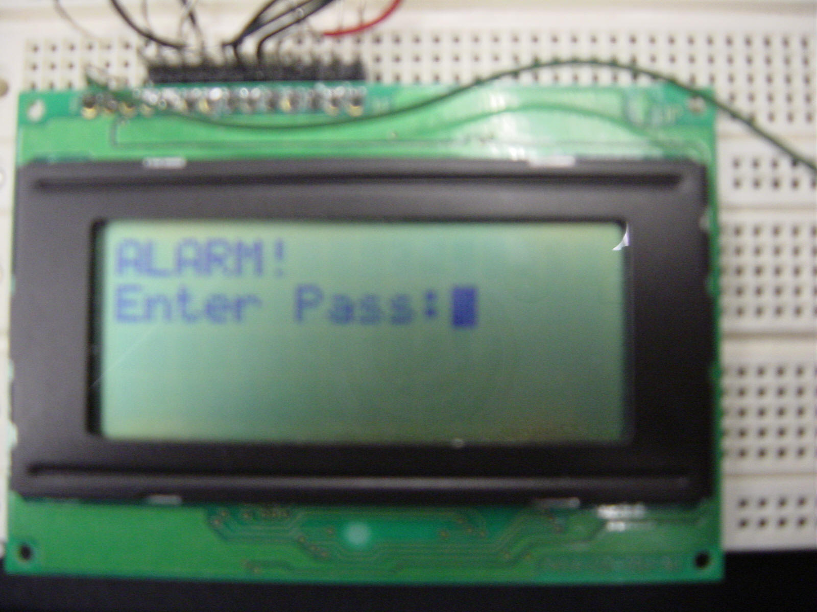When the window of the house is open, the distance threshold of the infrared distance sensor will be reached and it triggers the alarm. For our project, we have set the threshold to be 0x75. Any value greater than 0x75 will trigger the alarm. When sensor is being triggered, ˇ§Alarm!ˇ¨ will then be shown on the LCD display( Figure 4).