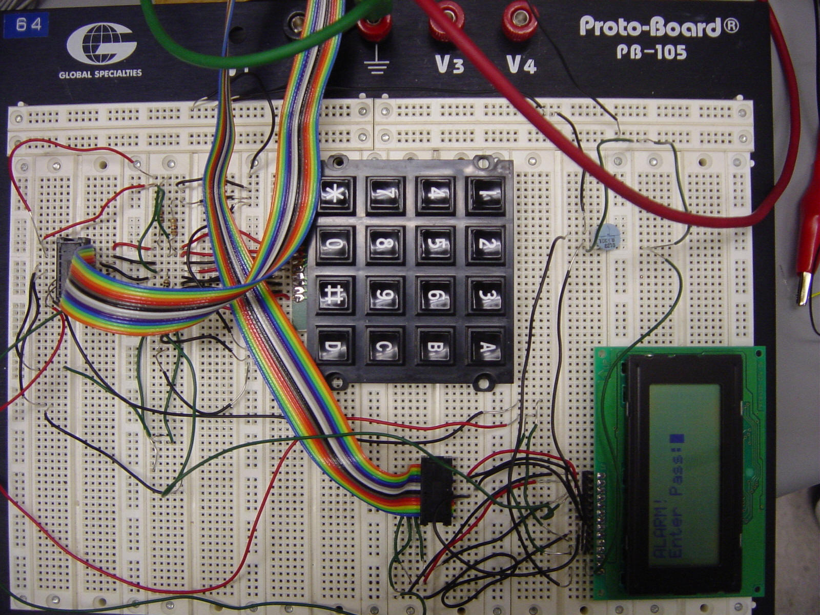 Our Home Security System interfaces with an infrared distance sensor to detect intruderˇ¦s entry into the house. The main console consists of a keypad and a LCD screen to allow users to key in password and to be notified of the system and alarm status. The console is connected to a HyperTerminal installed on a desktop PC to offer users an administrative mode. Users are then able to change the system password and to be able to find out extra information such as the error message and description of the alarm.