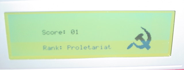 DC Motors - Our DC motors, which we aptly named “The Wheels of Industry” (which are greased with the blood of the working class) were attached under our machine to wheels level with the playing surface. A wing nut, and rubber washer were then attached to the wheels. The wing nut would hit the pinball as it spun, and the washer would grab the ball as it rolled over and fling it in a random direction. The rotational speed of these motors is controlled by comparators tied to the counters we used for our gates’ timing to create specific duty cycles, and increases with the player’s point value (more specifically, upon the rank he/she has achieved within the Communist Party) to increase the level of difficulty. Finally, we have some simple switches that accumulate points as the ball hits them, and a laser with an infrared phototransistor that is tripped by the ball falling past the flippers, to activate the ball return and restart the new round.