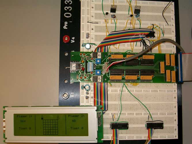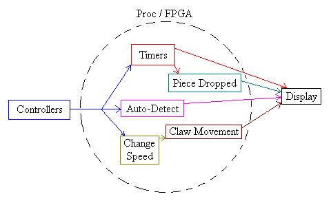 As mentioned above, our project was to design a two-player interactive Connect 4 game. This involved interfacing with hardware both on and off the MPC823 board. Off the board, we interfaced with the LCD screen as well as Nintendo 8 and Nintendo 64 controllers. When the game begins, the LCD screen displays an empty board in the center with claws holding the game pieces for player 1 and player 2. One each side of the screen, the players' information is displayed, with player 1 being on the left and player 2 on the right. The information includes the controller type being used and the time left until another piece may be dropped. The controller information is generated on the first poll of each controller, and the time counts down from 5 each time a player drops his or her game piece. Dropping is allowed when the time is equal to zero. An additional feature that we added is the ability to reset the game based on a combination of buttons pressed on either player's controller.