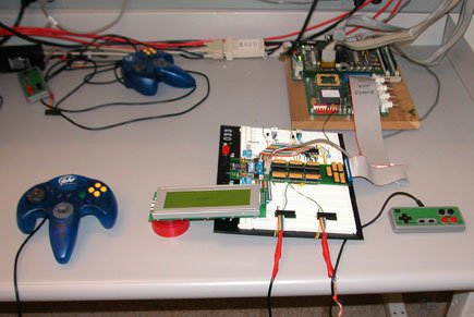 In-game screen showing both players able to drop a piece. Notice that player 1 is using an N64 controller while player 2 is using an N8.
