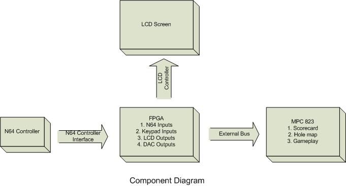 The main point of this project was to create a putt-putt golf game using a graphic LCD display and a Nintendo 64 controller. Both us are a big fan of putt-putt so this seemed like an interesting project. Our first major goal was to have the graphics work in real-time and at the same time maintian a high fps. We had been told from previous semesters that this would be a diffcult task. We also wanted a wide assortment of inputs in our game, so we decided to use the Nintendo 64 controller which has an adequate selection of buttons that we can use.