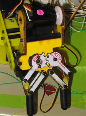 Our main problem was with the gripper claw itself. At first, the robotic arm had a gripper with a push pull rod attached to a servo. However, the rod kept coming lose, and we were never able to successfully use the claw. Then a new gripper was ordered with the micro servo added directly onto the claw gripper. After assembly, we tried to use this servo exactly as before, but immediately ran into problems. By default we were starting our program with our servos at 0.5 ms pulses, but the micro servo could not handle such a small pulse and we broke a small gear inside of the servo. However, we were able to take apart the servo, and since the broken gear didn’t rotate completely around, we could position it so that the servo would still function correctly.