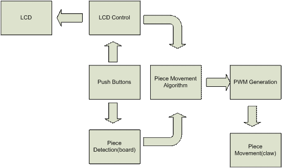 Our design consists of the main components listed above: a robotic arm which is controlled by 5 separate servos, a specially created board to detect piece locations, an LCD to display relevant game information to the player, and two pushbuttons to select pre-game options and to signal that the player has made a move.