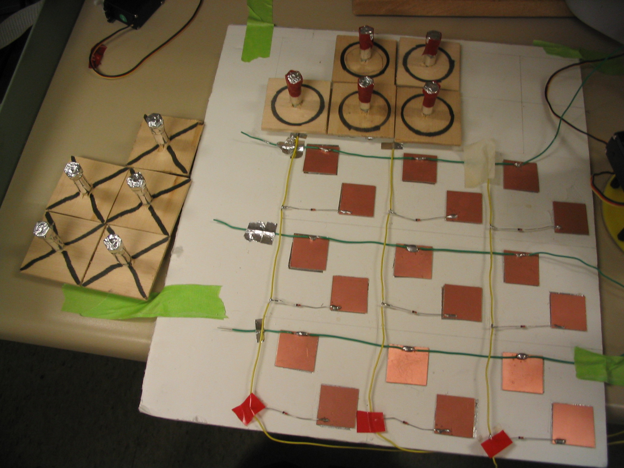 Another difficulty is the construction of the board. Initially we used metal tapes to tape on the board, but since metal tape’s surface is too slippery, we can’t solder the diodes and wires on to the tape. The solder simple slides off. Then we thought we could just use the metal tape to tape the diodes down, but due to the adhesive material at the back of the metal tape, we are not getting reliable connection at all. Finally we were given cut out 1x1 inch copper pieces which had a surface that is much easier to solder on. After that, the board can detect the pieces pretty well.