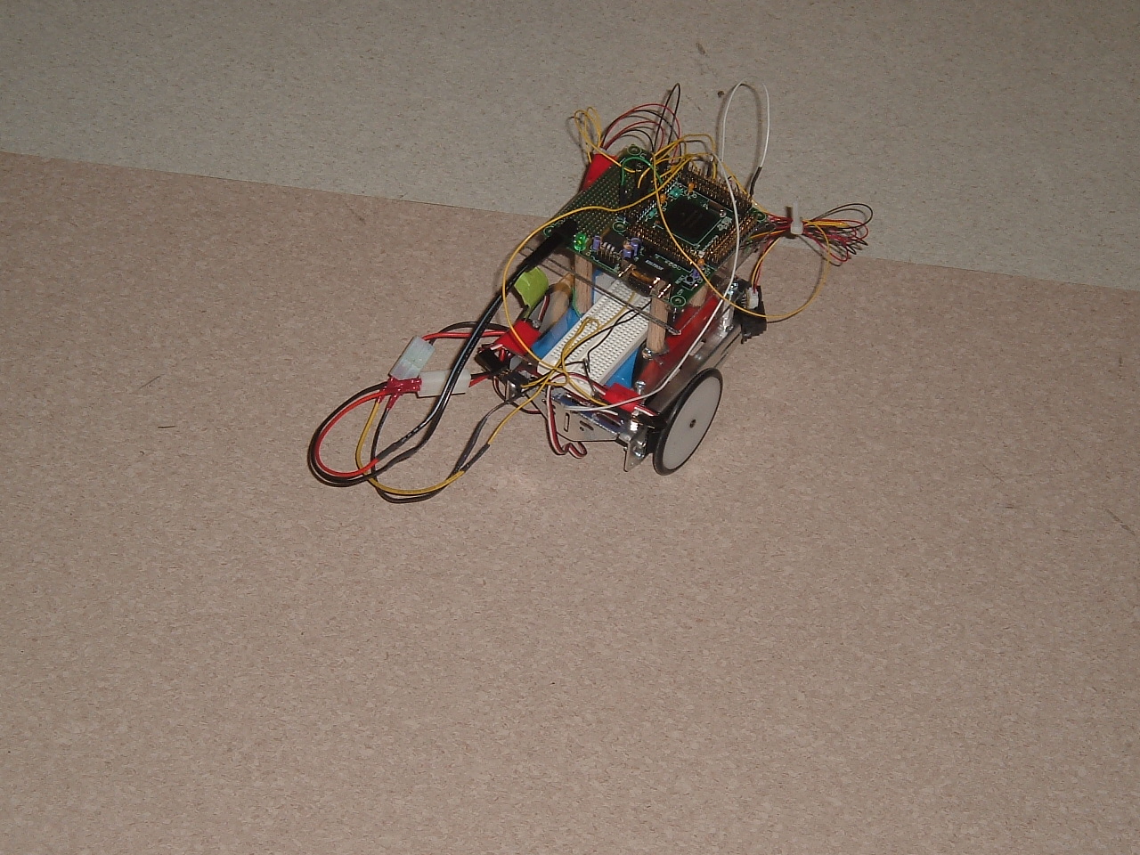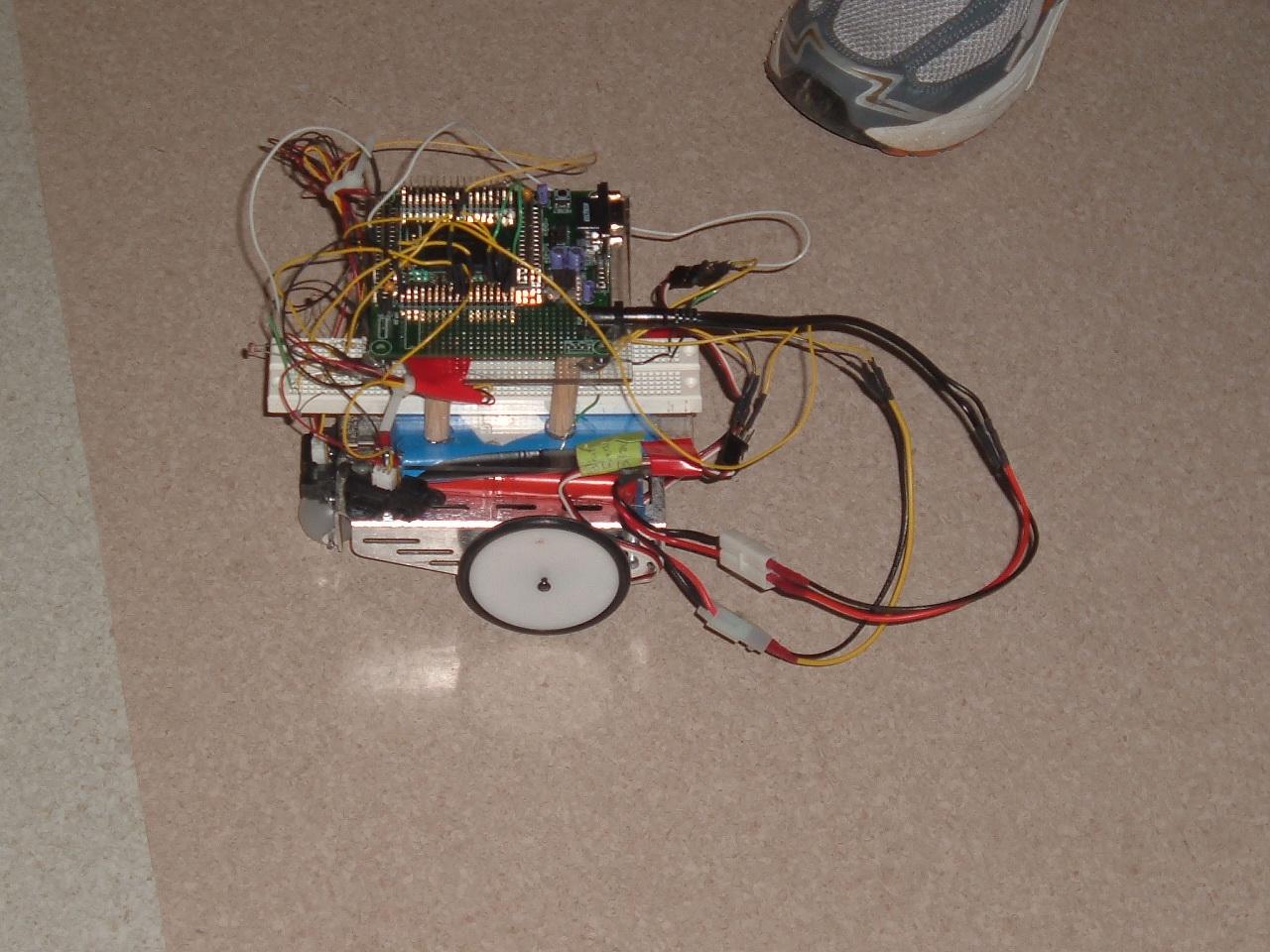 | Results of the Design | The MPC555 turned out to be very useful because a lot of things that we would normally have had to implement in hardware were already present on the board. Over all, everything worked the way we had planed. Our light following algorithm ended up being less complex than we had hoped and the vehicle did not always avoid obstacles as well as we had hoped. This was because the IR sensors didn’t have a very good connection and their readings were not always reliable. If we had to do the project again we’d probably either use different distance sensors or find a way to make the connection with the sensors more secure. Now that we know how the MPC555 works we’d also be able to add more features to our car. | |