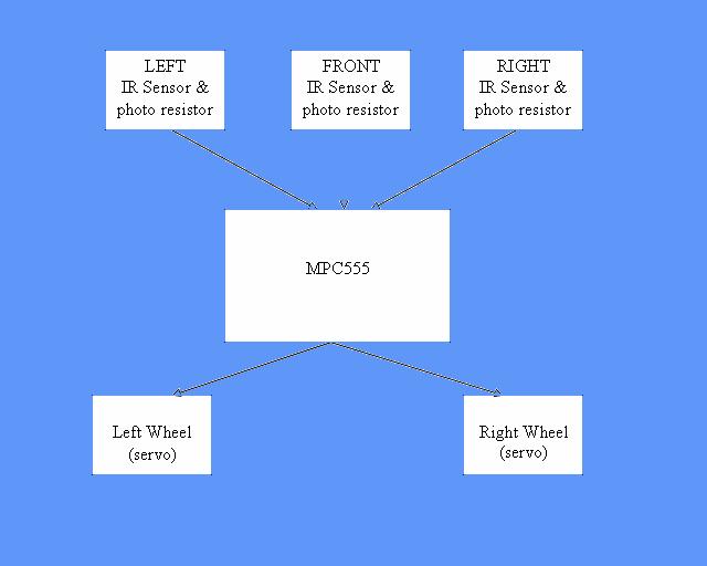 Our car was built using the Boe-Bot chassis and the MPC555. Our project was comprised of two types of sensors (IR sensors and photo resistors), the microprocessor, and servos to drive the wheels. The sensors were used to detect the direction of the source of light from the front, left or right of the car. The distance sensors were used to prevent the vehicle from running into any obstacles while following the light source. |