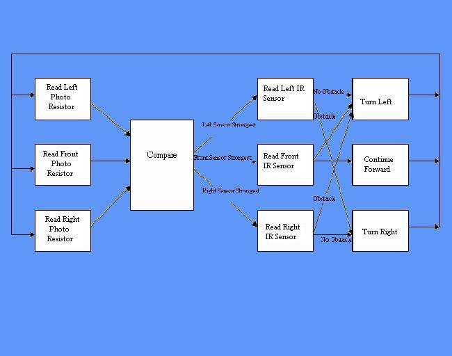 The majority of our software design was in our single interrupt handler. Once the values from the ADC were read, we modulated the pulse width to direct the car in the direction of the photo resistor that had the greatest ADC output value. If the IR sensor in that direction indicated that there was an obstacle, the car would turn to avoid the object. If the obstacle was located in the front or the right of the car, the car turned left. If the obstacle was on the left the car turned right. The MPC555 uses CodeWarrior to interface to the board. This enabled us to write all of our code in C. All the assemble code we needed for this project was already provided by Motorola.