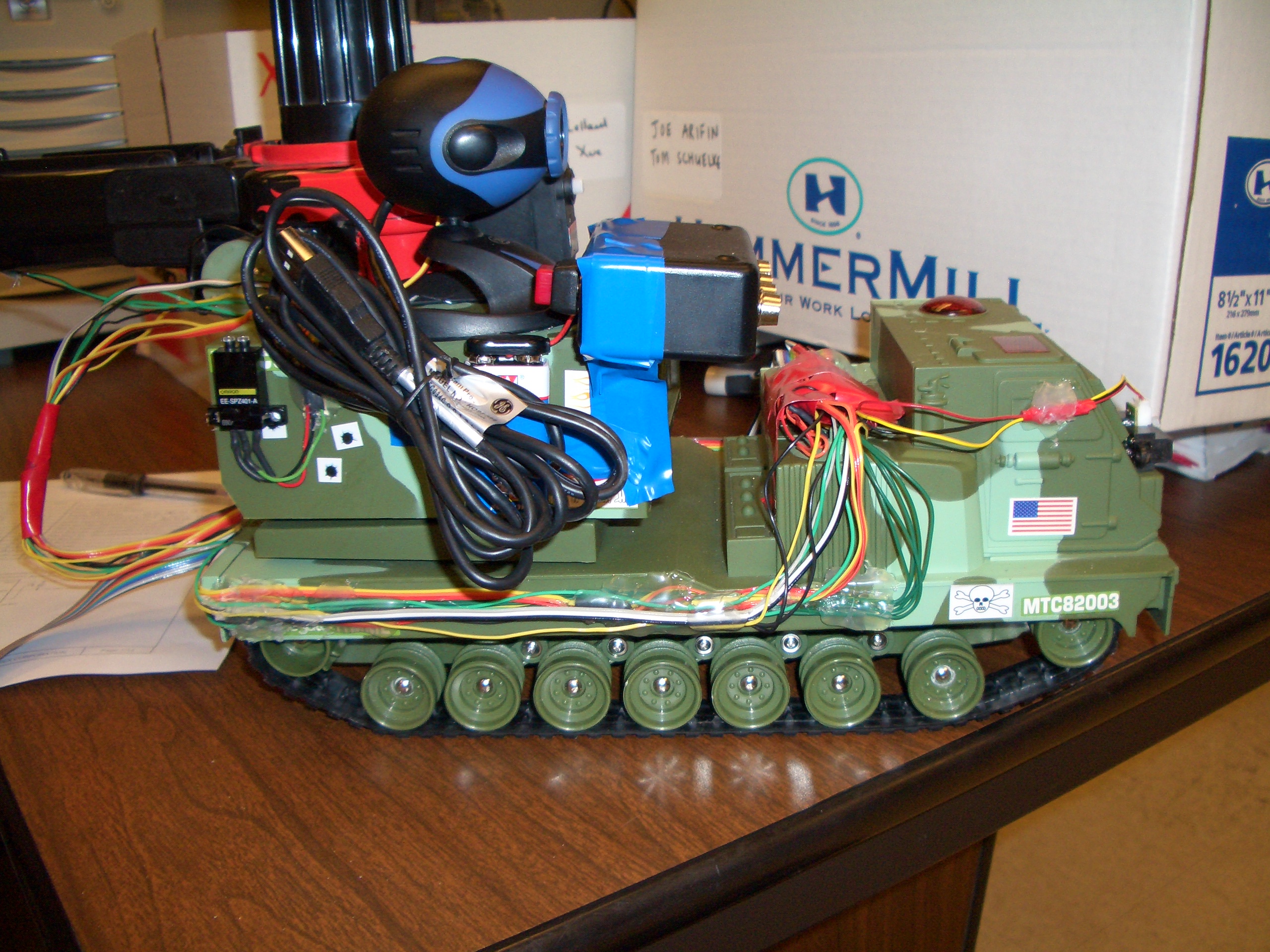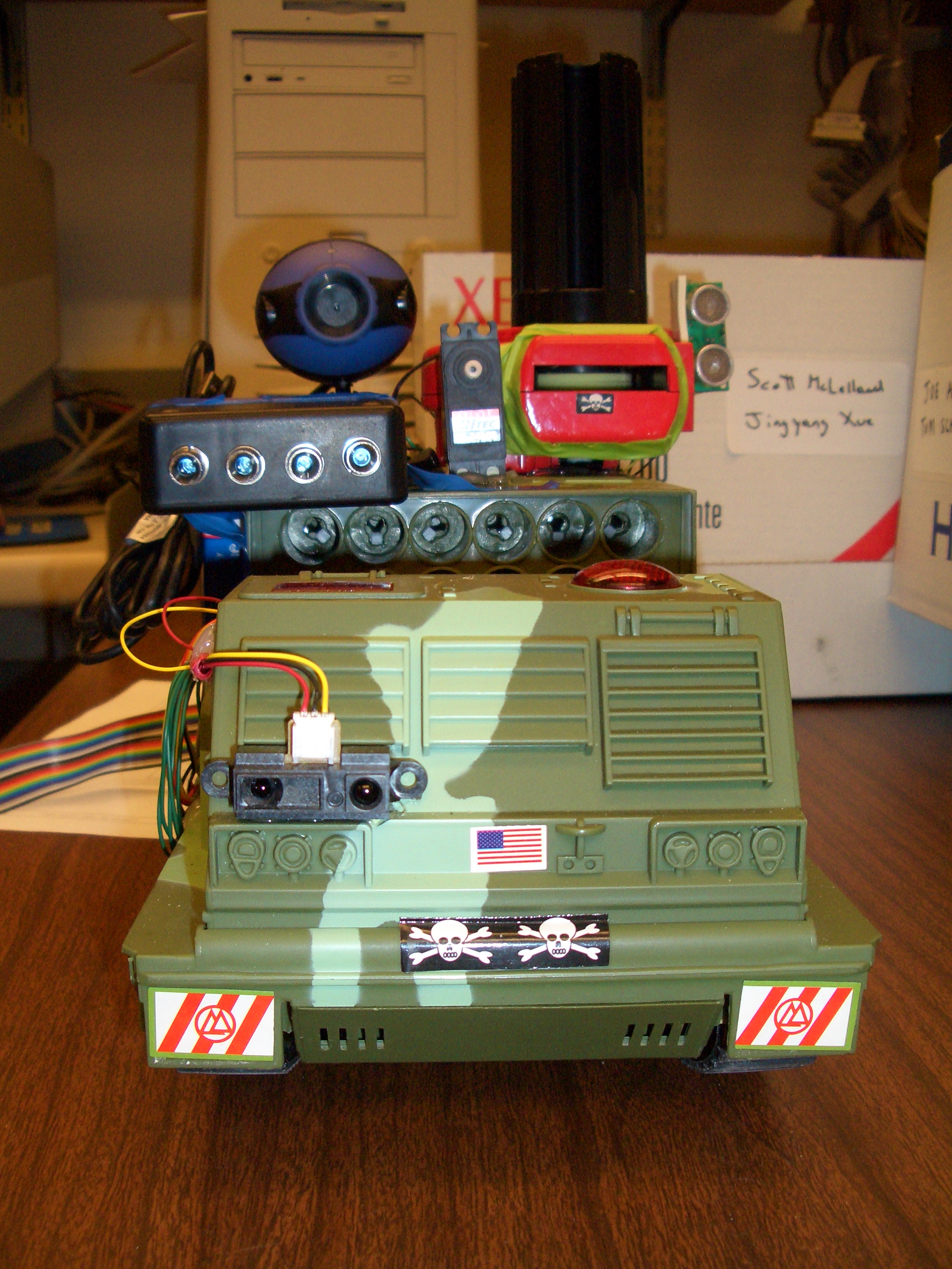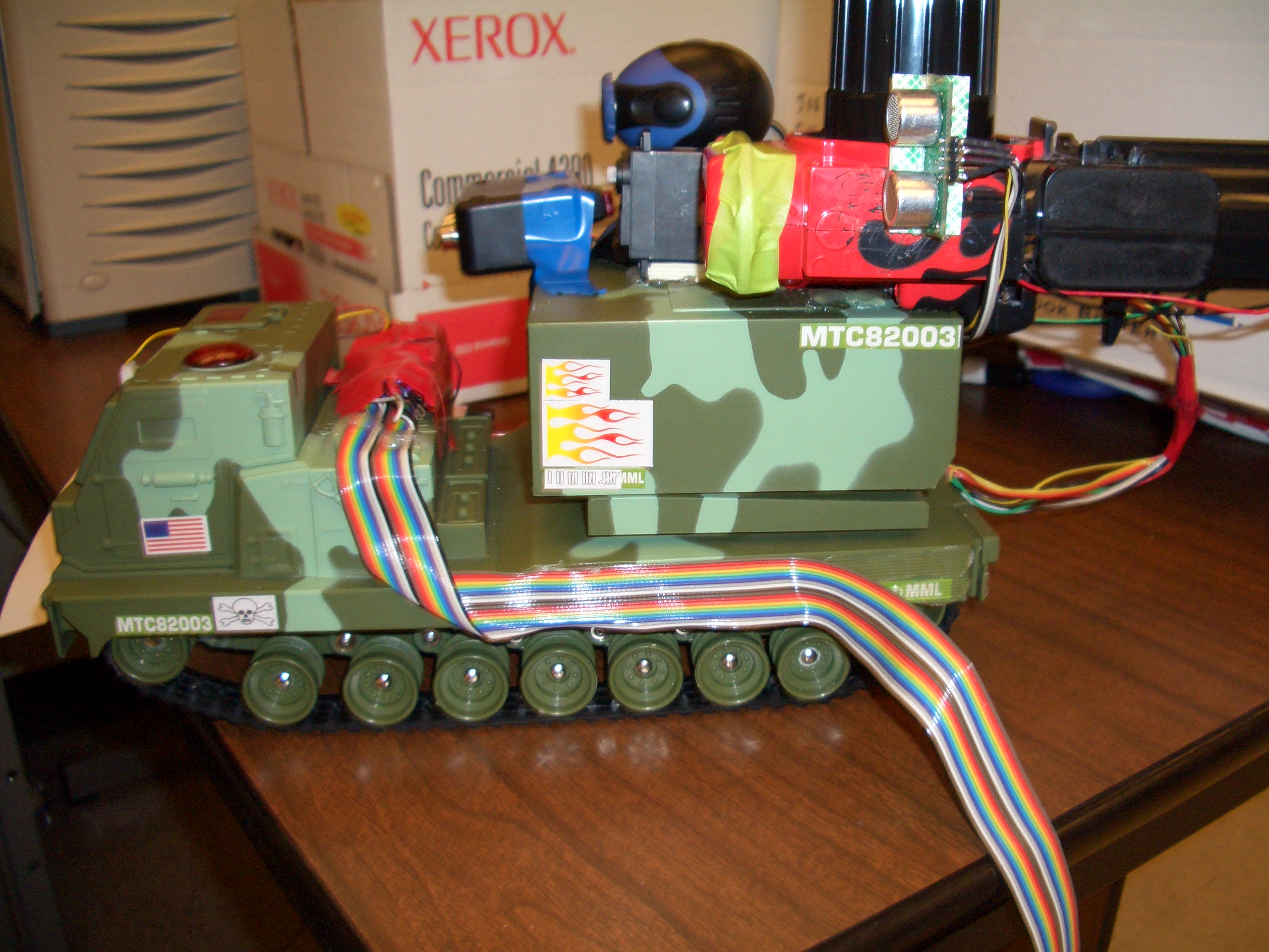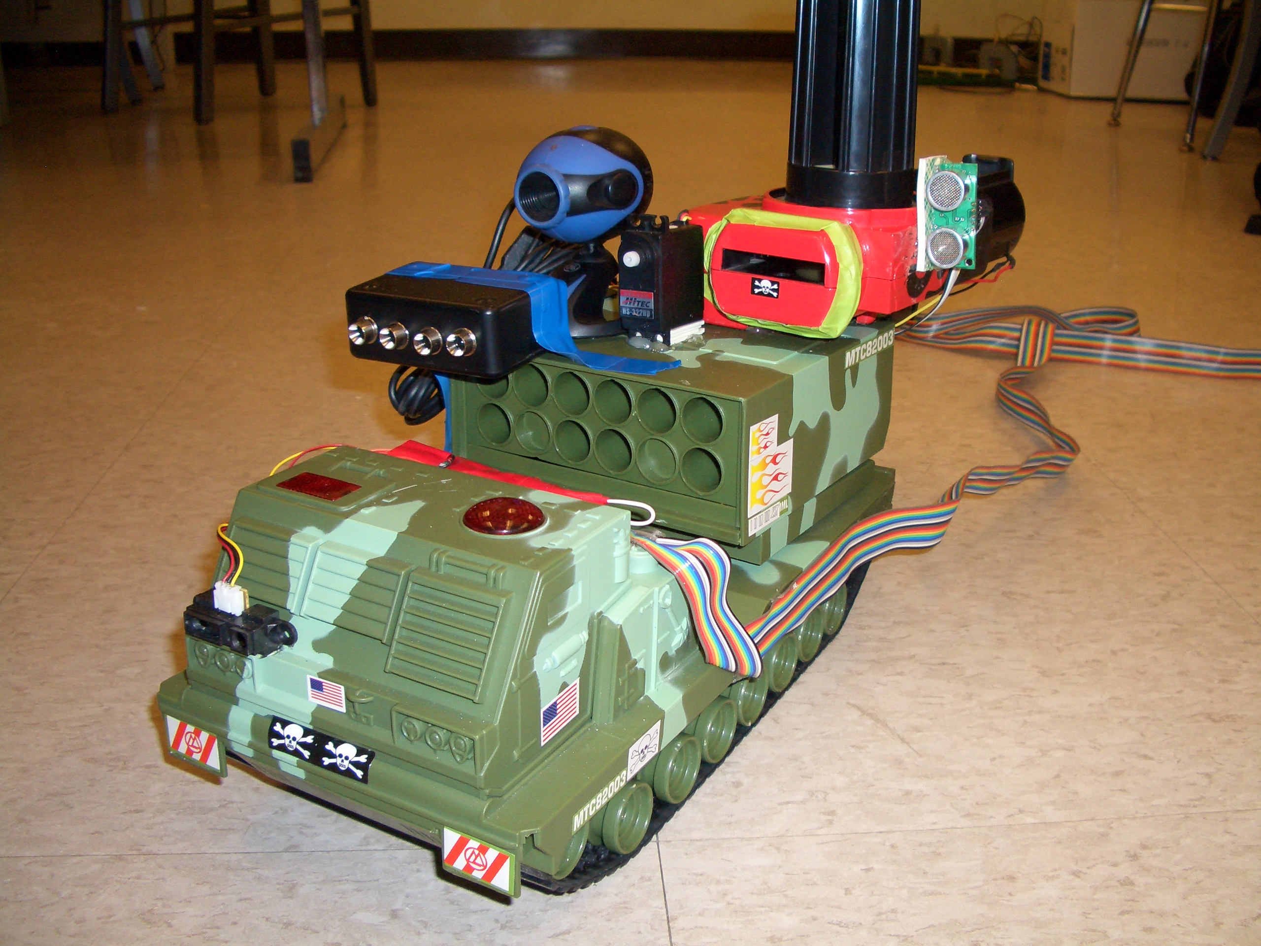 A few videos of the tank in action: Driving the tank around Firing discs using range finding More disc firing Infrared kill switch