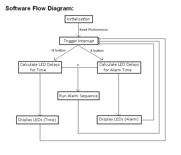 The software for the project is mainly based around the sensor interrupt.  It is important that this interrupt continues to run beyond other processes to ensure that the current time is always updated.  When the reference point on the disk crosses the sensor, an interrupt is triggered.  We expect this interrupt sequence to run every 8.33ms since the hard drive is spinning at 7200 RPMs.  Every time it is triggered, each of the three LED colors are given a value indicating how long to delay the flash of the LED and then they are written to the LED memory mapped location.  The longer the flash of the LED is delayed, the further around the clock the hand will show up.  A timer also starts during this time and masks out any interrupt for 7ms to ensure that any noise can’t cause false interrupts.  Depending on how many times the interrupt has triggered, the delay value for each hand is incremented accordingly.