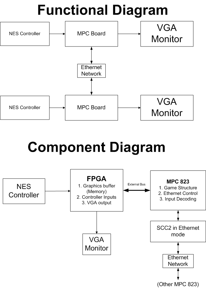 Each station is built around an MPC 823 processor/FPGA board, utilizing an NES controller that interfaces to the FPGA and provides input to the game running on the processor. The game board itself is displayed on a VGA monitor, with a framebuffer and the VGA hardware implemented on the FPGA. Our software for this project not only includes the Battleship game itself, but also software routines to check NES controller input and send and receive Ethernet packets. We also had dedicated software libraries of data or assembly calls, used to display different sprites on the VGA screen.