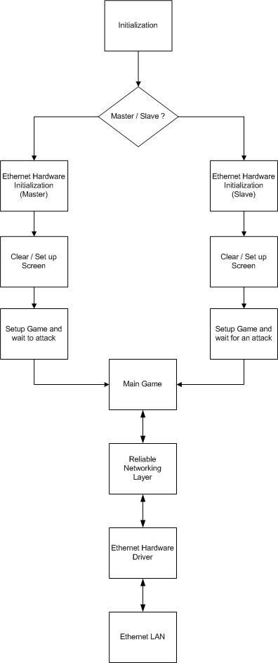 The main game consists of two parts: a main initialization routine and the Battleship game itself. The main initialization is written in assembly and is used to initialize the timer interrupts for the NES controller, as well as initialize the MPC823’s SCC2 serial controller to work in Ethernet mode. The main routine also checks one slide switch to tell it whether its station is acting as the slave or master for a game (The master is simply the player that attacks first, but this information is also used to initialize the Ethernet controller and determine the MAC addresses for each of the stations). The main function then branches to the game itself.