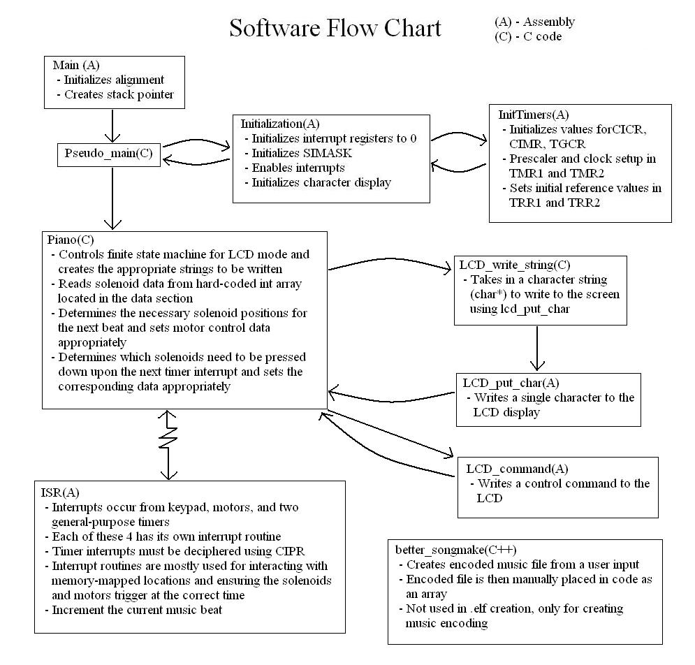 The software is split between C and assembly code. The C code controls the algorithms that determine which keys will be pressed and how much the motors need to be moved between key presses. These values are stored in external variables that can be used by the assembly code during interrupts. The C code also controls the LCD character display by determining the correct lines needed to be written and calling a simple assembly function to write the values to the memory mapped address.