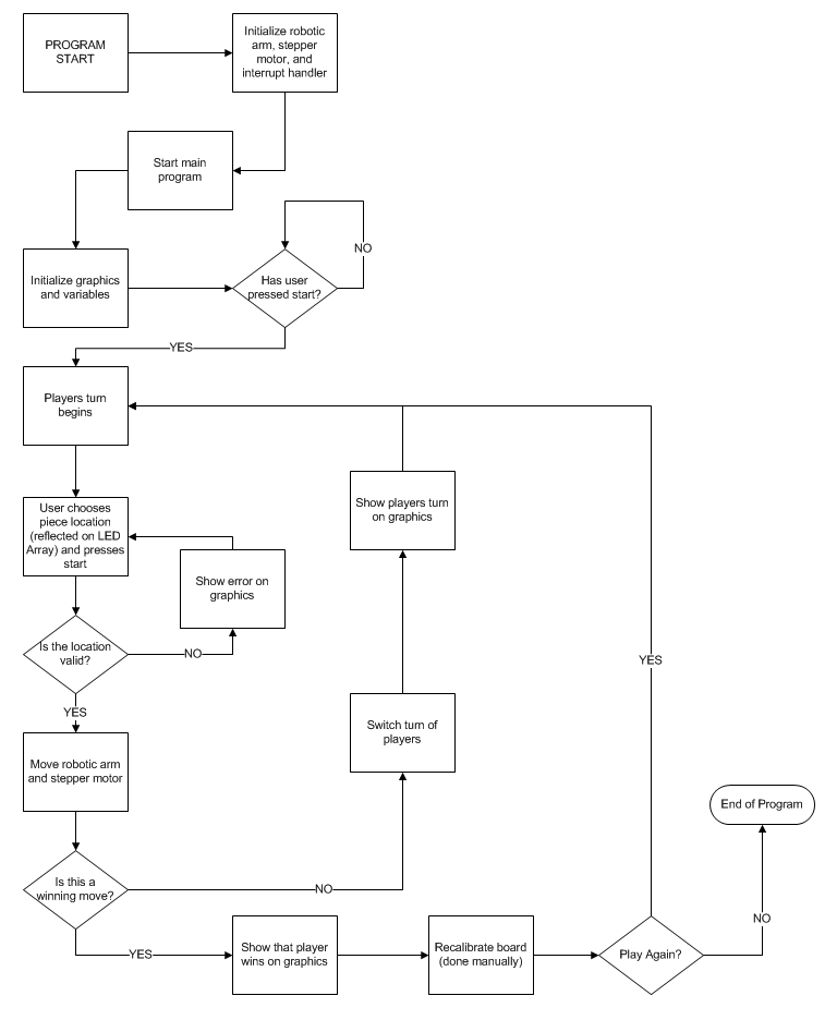 One of the effects of the graphics was that if a bad move was done, the screen would blink, similar to an error message found on many modern computers. In order to accomplish this task, we set up an interrupt to go off every second. The interrupt would then update the counter register. When a flashing graphics was to display, we would poll the counter register, keeping track of changes. The reason we would poll the counter register was because while the graphics were changing, we wanted to lock the game (so that the user would not be tempted to make bad moves for the rest of the game. We would also do this for other screens that should be seen and not bypassed, such as the opening screen and the player win screen.