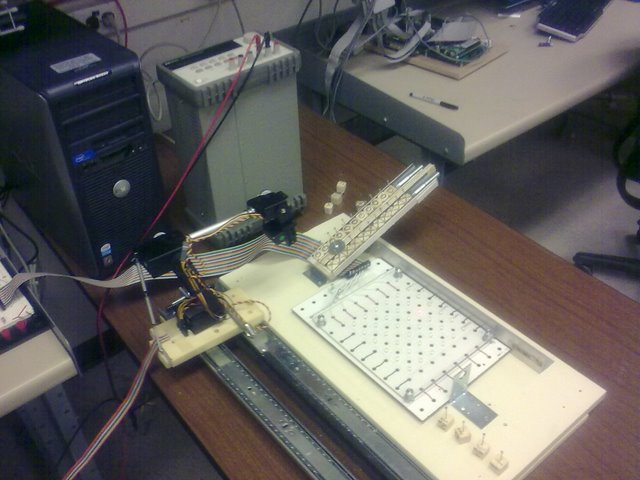 The goal of our project was to create a hands-free tic-tac-toe game. To accomplish this, we intended on using a DDR pad to pick where to move a piece. We would receive feedback for this from an LED Array. We would then have a stepper motor and robotic arm move together in order to place the piece in the correct location, while a graphics display would give feedback on the state of the game. When we found out that our DDR Pad was broken, we opted to use a keyboard and HyperTerminal in order to bypass the DDR Pad.