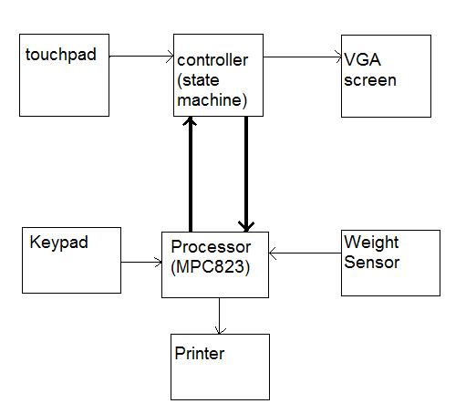 As the brain of the project, the controller (a state machine implemented in hardware) changes frames in the VGA and drives the software via interrupts. Signals from the processor and XY coordinates from the touchpad change the current state of the controller. |