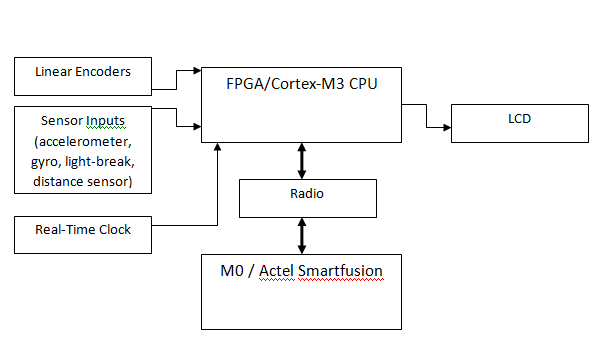 To measure completion and success of the fitness tasks, we used many sensors. Our device consisted of measurement components used to monitor performance of fitness tests (accelerometer, gyroscope, light-break sensor, IR distance sensor), interface components used to interact with the system (LCD), and communication components used for inter-device data sharing (radio).