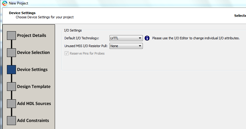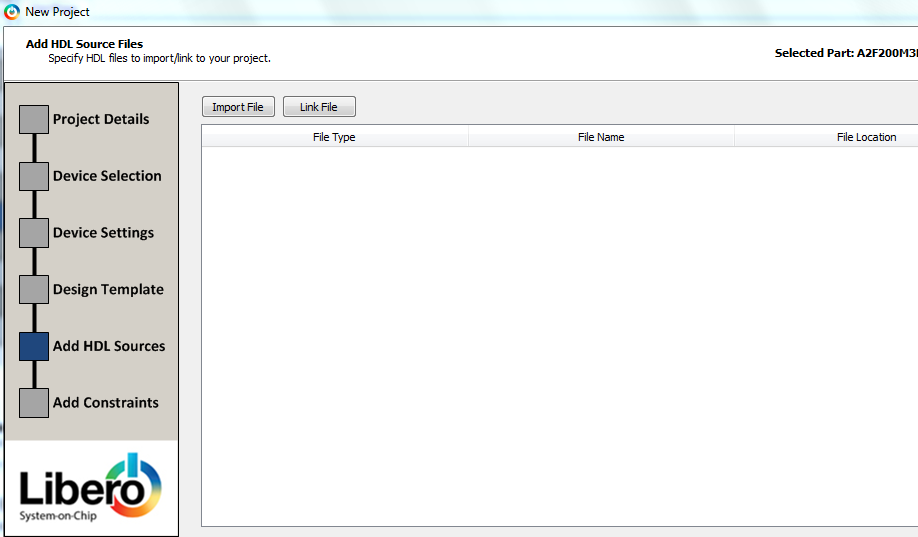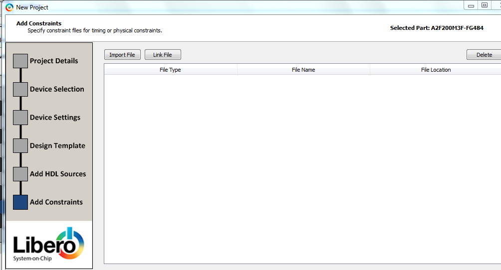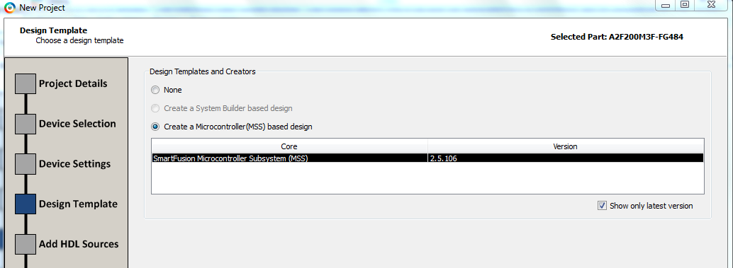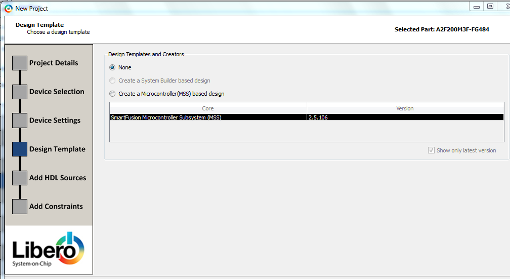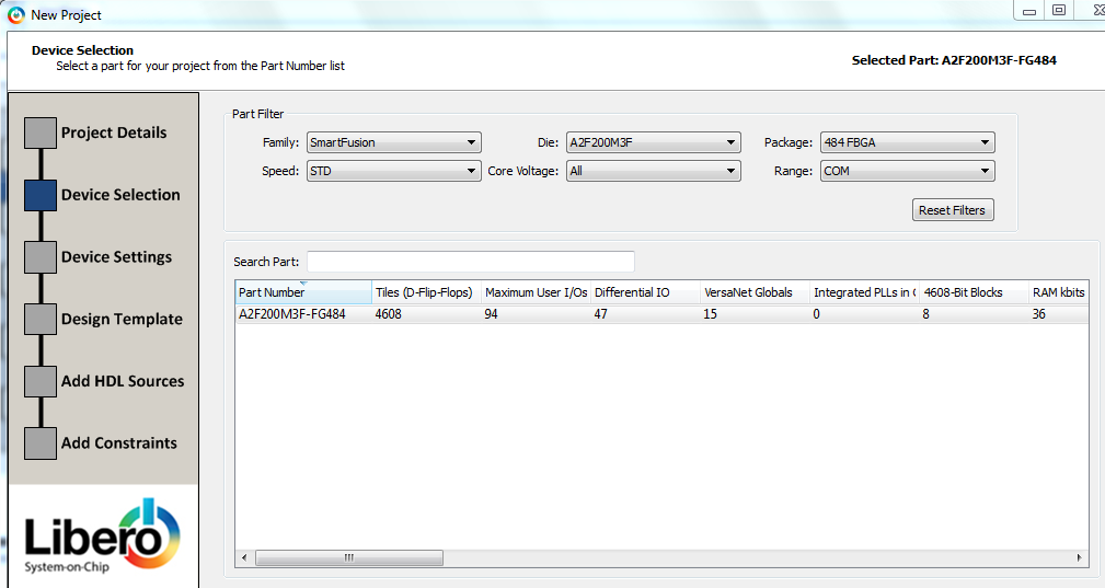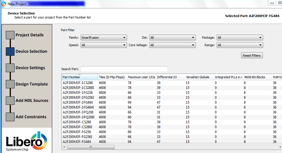 The settings should look like this after you are finished with the A2F200M3F-FG484 the remaining part choice.