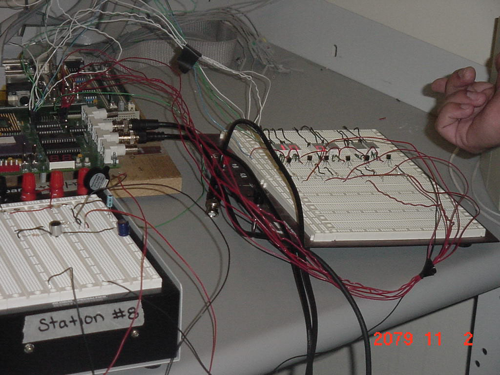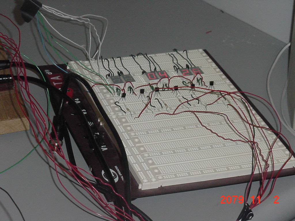 7-segment LEDs -- We used six of these to display the time output in hours, minutes and seconds. They were interfaced to the Xilinx board and processor via the test points. A six input multiplexer was used to display output and speeds too fast for the human eye to detect (in reality, only one LED is being updated at a time -- you can see this effect in one of our photographs).