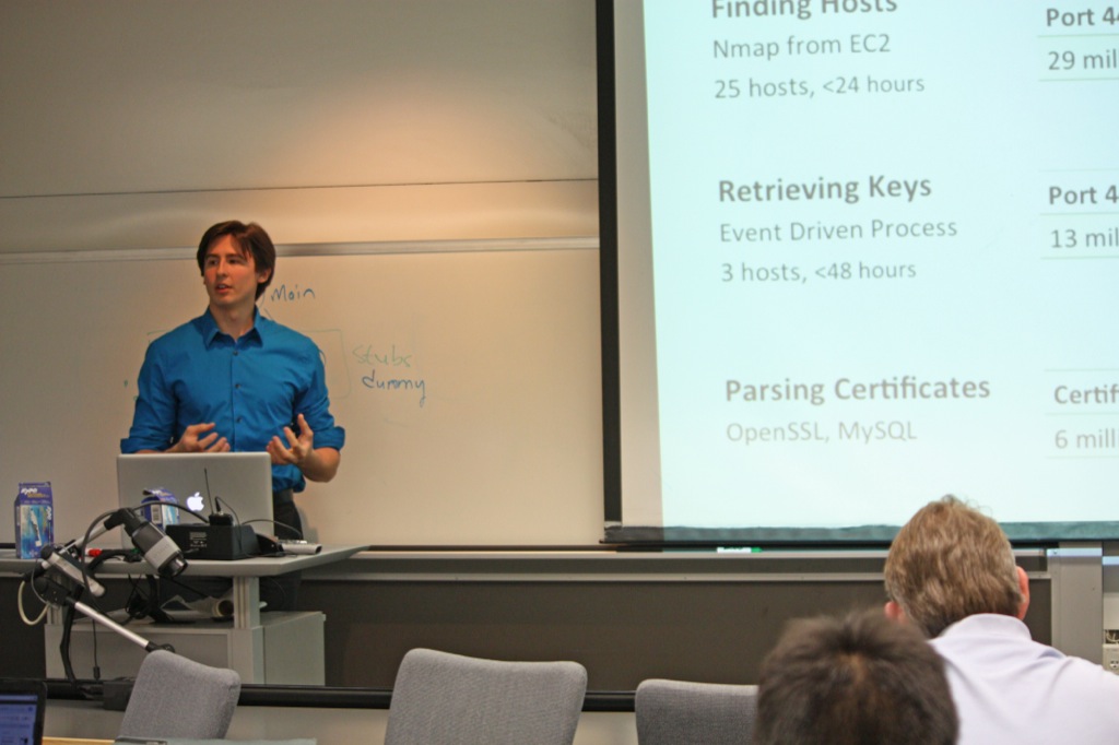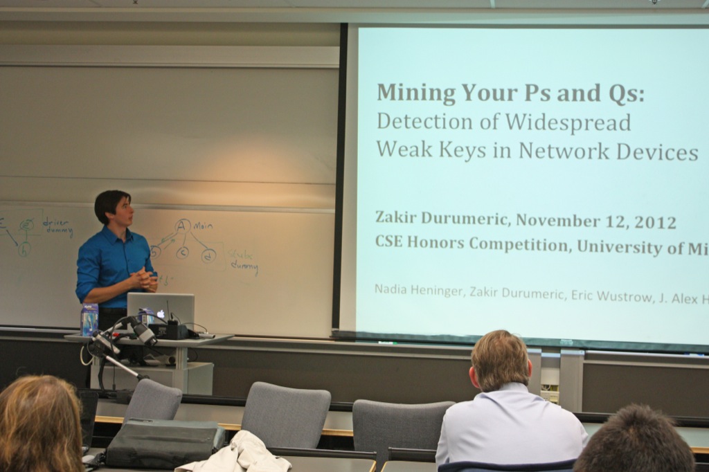 Zakir Durumeric: "Mining Your Ps and Qs: Detection of Widespread Weak Keys in Network Device." (Second Place) Advisor: J. Alex Halderman.